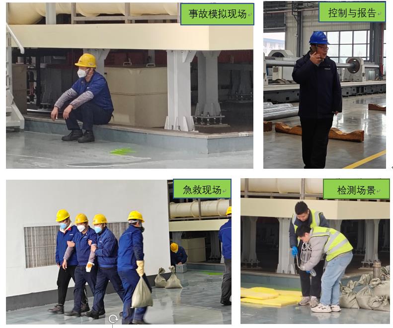 特種缸車間作為本次事故模擬地點(diǎn)、公司根據(jù)應(yīng)急救援和措施展開系列現(xiàn)場(chǎng)搶險(xiǎn)與報(bào)告、及時(shí)聯(lián)系高新區(qū)事故接警、做好企業(yè)警戒及響應(yīng)和搶險(xiǎn)行動(dòng)、配合消防組織和檢測(cè)機(jī)構(gòu)展開事故處置,并完成應(yīng)急和善后行動(dòng)。